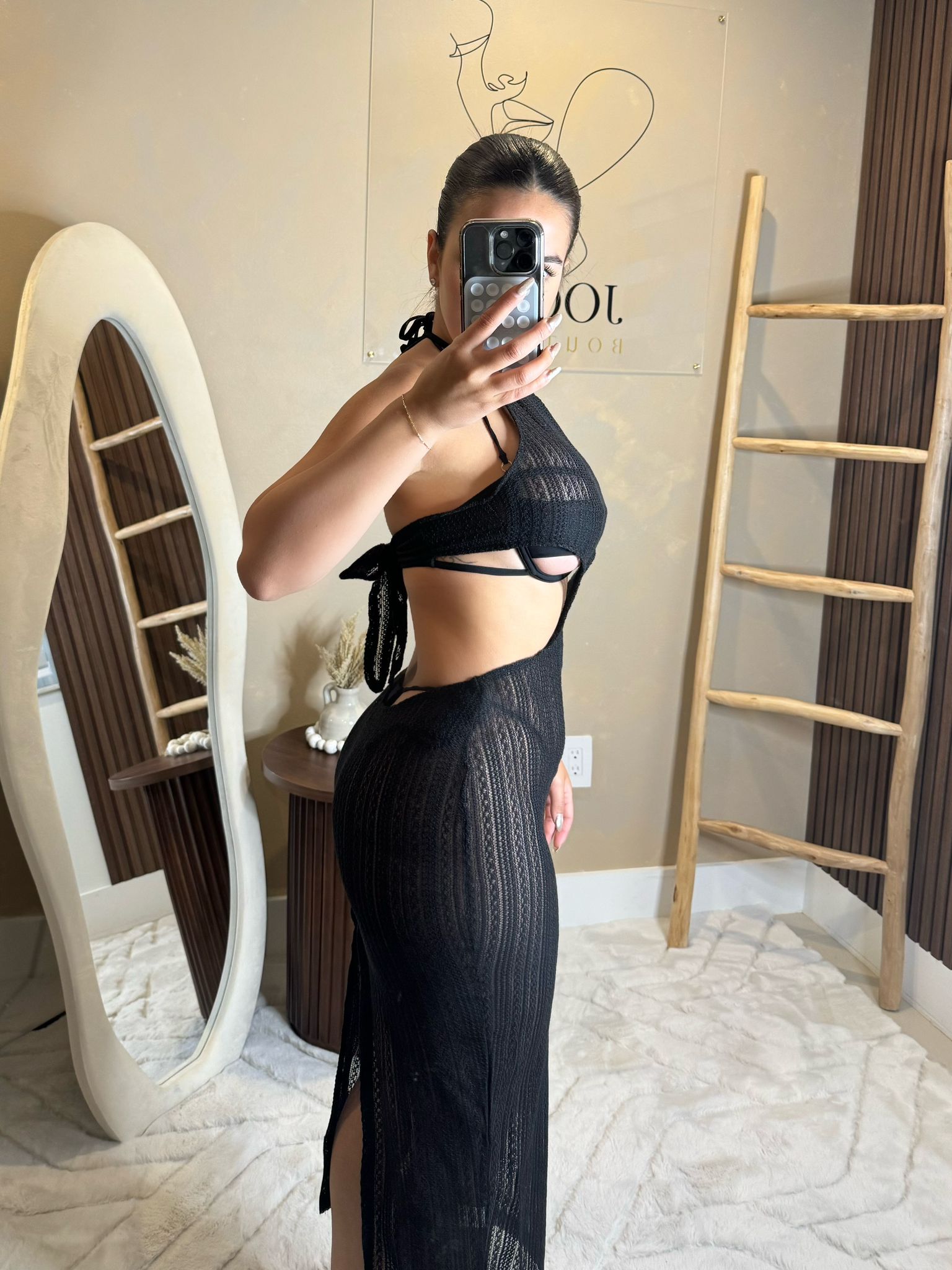 Sultry and chic — The Onyx is a sheer black crochet midi cover-up dress designed to accentuate your curves while keeping it cool. Side cutouts and a leg slit bring a bold beachside energy to your swimwear look.